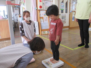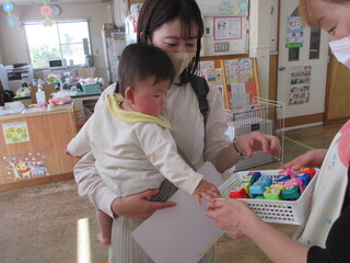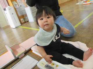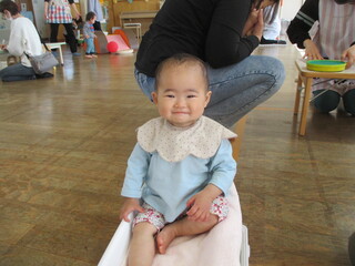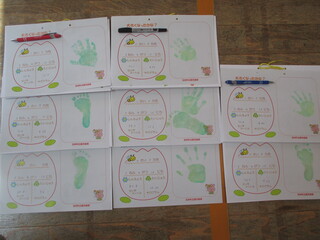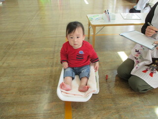 ハイハイ、よちよち、とことこのおともだちが大集合‼初めて身体測定に参加してくれたおともだちはちょっぴりびっくりしていたけれど、ママに抱かれて記念の手形(足型)もとれました。測定前の「いないいないばぁあそび」と紙芝居は大興奮でした♪