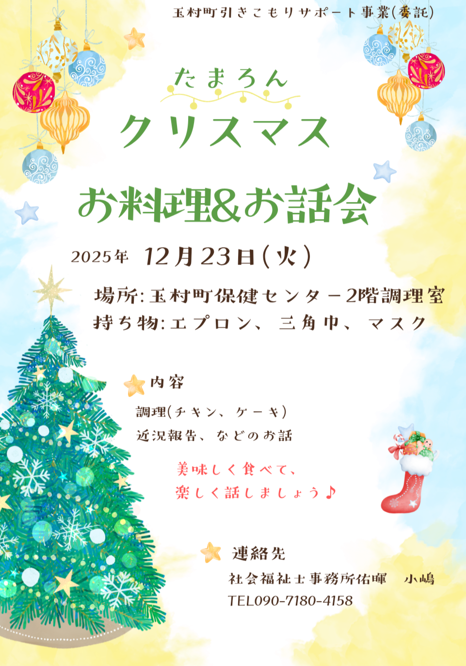 「たまろん」は、町内在住のひきこもり当事者が参加できますので、事務局までご連絡ください。