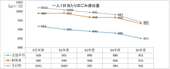 令和元年度から令和5年度までの、玉村町のみなさん一人ひとりが毎日出しているごみの量は、表2のとおりです。令和5年度は、令和元年度より80g少ない942gまで減少しましたが、全国平均よりも91g、群馬県平均よりも9g多い結果となっています。