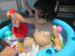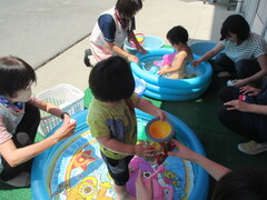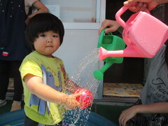 バケツで水をくんだり、水鉄砲の中に水を入れてピュー💦と飛ばしたり。