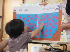 はじめに「きんぎょがにげた」の大型絵本を見て、たくさんいるきんぎょの中から「見つけた〜💓」と