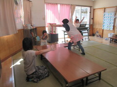 逃げ出したきんぎょをさがして遊び、♫さかながはねて♫のメロディーに合わせて表現遊びも楽しみました。