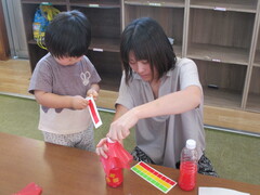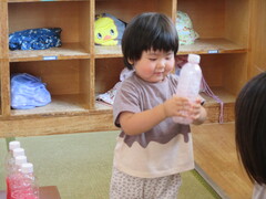 お水が入ったペットボトルを振っていると…!? あれっ?? 赤いお水に変身しちゃった〜!