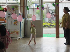 (ブドウのつるに吊り下げた風船にタッチ!)