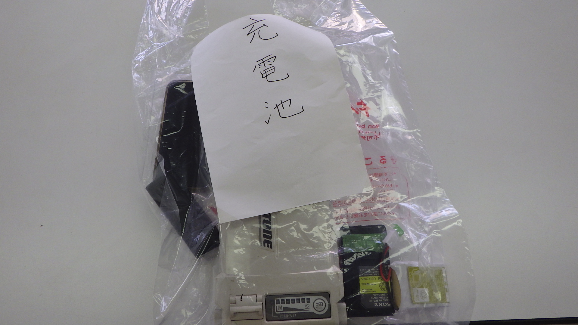 ◆下の画像のように、透明な袋に充電池を入れて、袋に「充電池」と書いた紙を貼るか、袋に「充電池」と直接書いて、中身がひと目で分かるようにする。