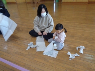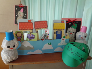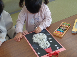 今日は最初にホールであいさつをしました。雪は白いサイクル紙をビリビリと破き、丸めて雪を作りました⛄