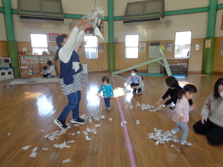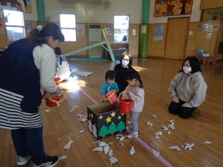 紙の雪を投げたり、降らせたりしました❄❄❄⛄雪を箱の中に全部入れたら、くじらクラブのお部屋に移動します。