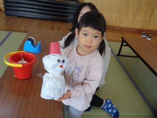毛糸の雪だるまアートをしました🎨。ビリビリした紙を白いビニール袋に詰めて可愛い雪だるまが出来ましたね⛄