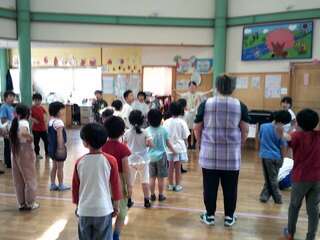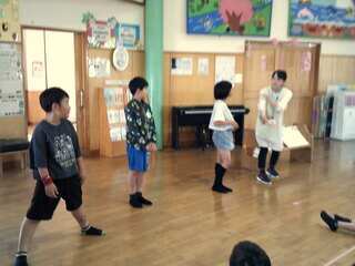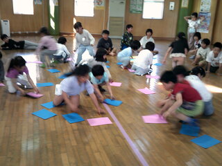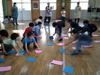 前と言われたら前と言いながら後ろにジャンプするというルールです。難しいルールでしたが、子どもたちは頑張っていました!