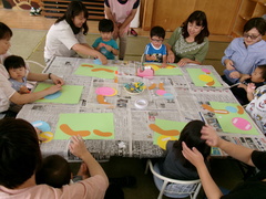 手遊び🙌から始め、エプロンシアター「ぞうの鼻はなぜ長い」を演じた後、製作の花の色を決めたり、難しい工程は保護者や支援者が声掛けしながら、だんだん完成してくるリースにニコニコしていました。
