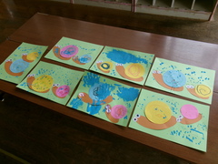 6月は☔雨が多いこともあり、雨が大好きな🐌かたつむりさんを制作し、そこに絵の具の雨を指や手を使って