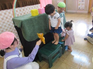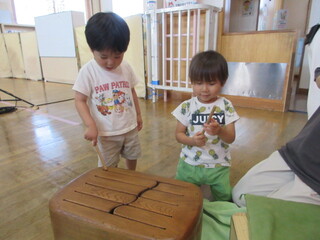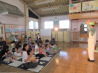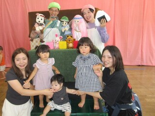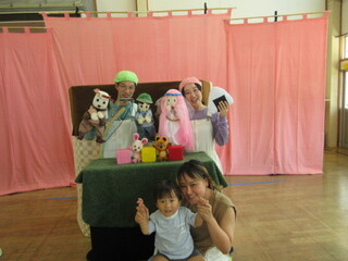今月は『人形劇団くぐつ』さんによる人形劇をみんなで鑑賞しました。ウクレレとハーモニカの音に合わせて一緒にうたったり、クイズをしたり、「金の斧銀の斧」の人形劇を観たり、盛りだくさんでとても楽しい時間を過ごすことができました。おだやかな優しい雰囲気の中でお話も進んでいき、ママも子どもたちもリラックスして参加できていたようです。お話のあとは「じゅんちゃん、ゆかちゃん、お人形たち」と一緒に記念撮影もできて、ステキな思い出がひとつ増えたことと思います。来月の親子教室はおやすみです。9月からもいろいろな活動を計画していますのでおたのしみに(*^^*)