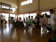 「○×ゲーム」の会場にみんなが集まり、これからゲーム説明が始まります。