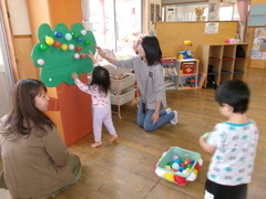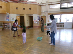 2番めの競技は「くだもの玉入れ」です。木になっている美味しそうなくだもの(カラーボール)を採ってカゴに入れます。