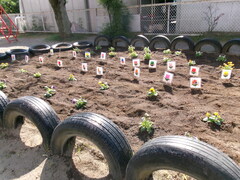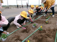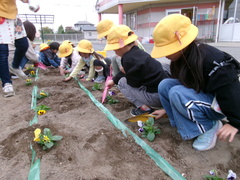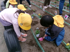 今月は『お花を植えよう!』です。1年生が、お花の苗や球根を花だんとプランターに植えました。