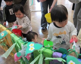 今月は「いちご狩りごっこ」ということで、みんなでお花紙でいちごを作り、バスにのっていちご畑へ。いちごをたくさん収穫して遊びました(*^^*)